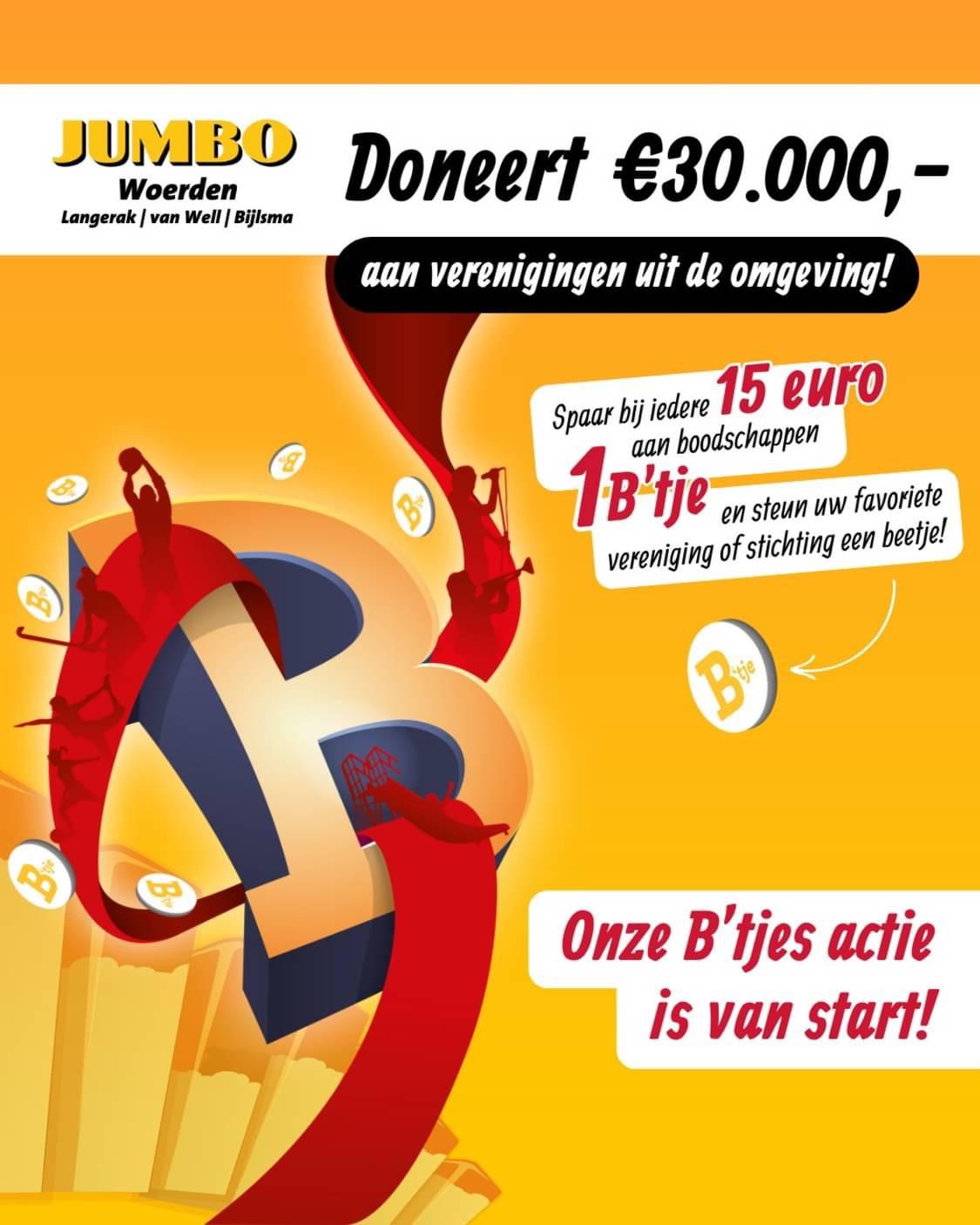 Wij doen dit jaar weer mee met de B'tjes actie. Bij de jumbo supermarkten in Woerden ontvang je bij iedere aankoop van €15 aan boodschappen een B'tje waarmee je scouting woerden kan steunen. Deze actie loopt van 25 augustus tot 19 oktober.